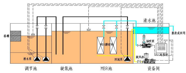 主要包括一下五大單元:(1)調(diào)節(jié)池、(2)缺氧池、(3)MBR池、(4)設(shè)備間、(5)清水池