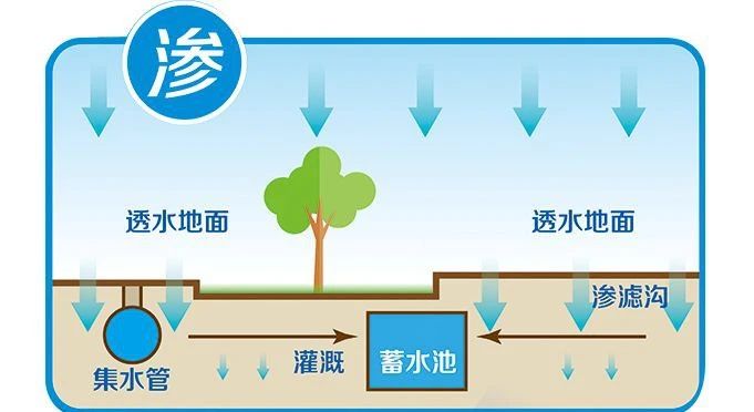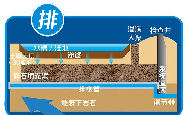 改變各種路面、地面鋪裝材料,改造屋頂綠化,調(diào)整綠地豎向,從源頭將雨水留下來(lái)然后“滲”下去。