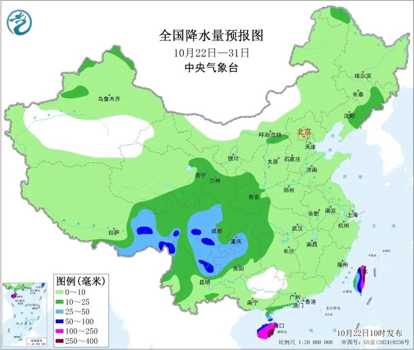 據預報,未來10天(10月22—31日),西北地區東南部、西南地區大部、西藏東部等地累計降水量有10~30毫米,局部50~70毫米;華南沿海及中國臺灣地區累計降水量達30~70毫米。